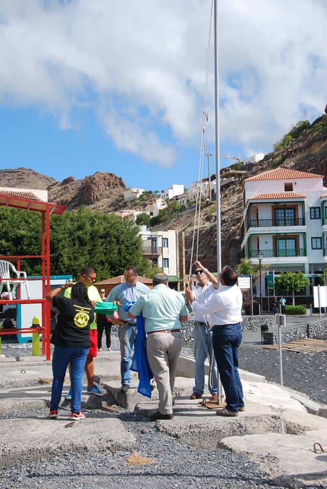 La Bandera Azul. Concedida por la Fundación Europea de Educación Ambiental ondea desde ayer, lunes 13 de junio en Playa de Santiago tras el izado llevado a cabo por el Ayuntamiento de Alajeró durante un sencillo acto que certifica por sexto año consecutivo que este lugar de la costa insular es el único de La Gomera que ha sabido conseguir un difícil reconocimiento que comparte en Canarias con 50 galardones de este programa medioambiental internacional además de otros seis reconocimientos como los de Centro Bandera Azul, Senderos Azules, y distinción temática por accesibilidad y atención a discapacitados.