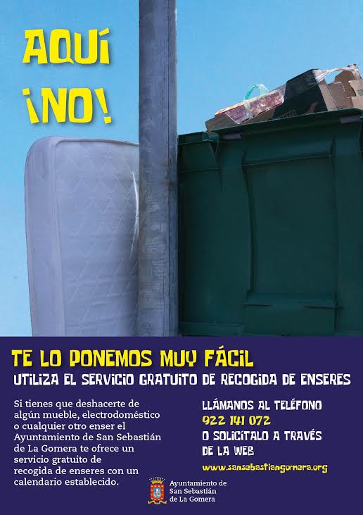 Finalmente, la campaña recuerda el servicio gratuito de recogida de grandes enseres y que se realiza cada dos jueves en todo el área municipal de San Sebastián, siempre bajo petición previa. Con este motivo, el Ayuntamiento ha puesto en marcha un nuevo sistema de petición más ágil a través de la nueva web www.sansebastiangomera.org, en el área de Obras y Servicios, y donde además de encontrar el calendario de recogidas podrán solicitarlas por un formulario electrónico.
