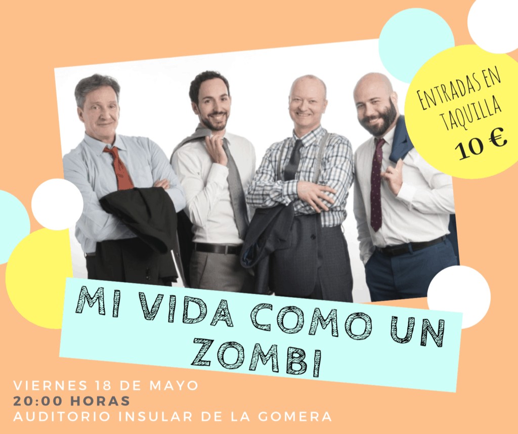 El Auditorio Insular de La Gomera será escenario este viernes 18 de mayo de la nueva comedia de la compañía Doble M, que se podrá disfrutar a partir de las 20:00 horas. ´Mi vida como un zombi` es la obra protagonizada por Adrián Rosales, Zebensuí Felipe, Vicente Ayala y Carlos Brito, bajo la dirección de Nacho Almenar. Una obra que supone una nueva vuelta de tuerca a la comedia más gamberra y crítica, a través de los ojos de la compañía Doble M, en la que se incluye mucha crítica al sistema laboral que moldea y esclaviza la vida de los personajes.