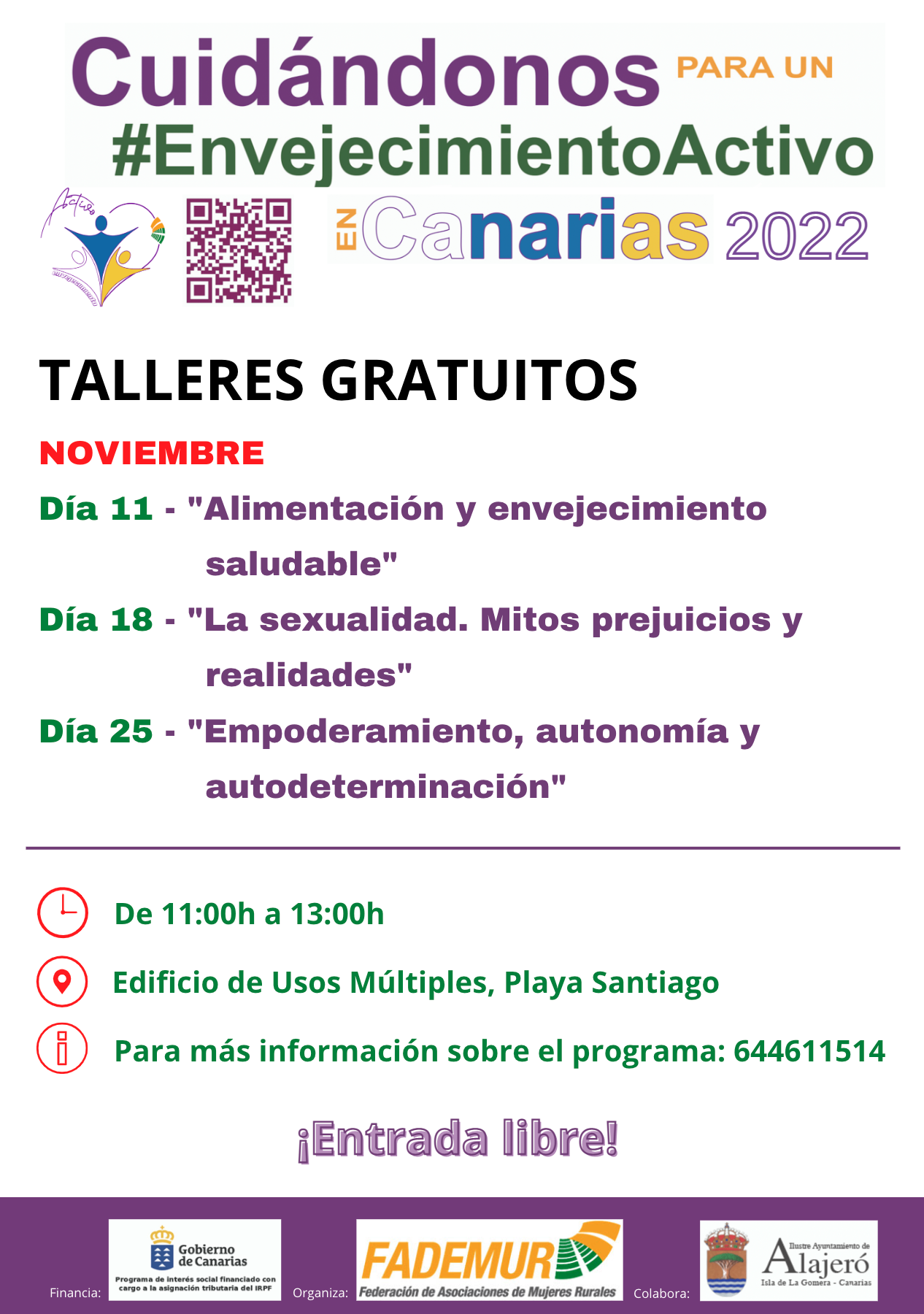 Los días 11, 18 y 25 de noviembre en el edificio de Usos Múltiples de Playa de Santiago se celebrarán tres talleres respectivamente sobre ‘Alimentación y envejecimiento saludable’, ‘La sexualidad. Mitos prejuicios y realidades’ y ‘Empoderamiento, autonomía y autodeterminación’ todos ellos en horario de 11:00 horas a 13:00 horas.