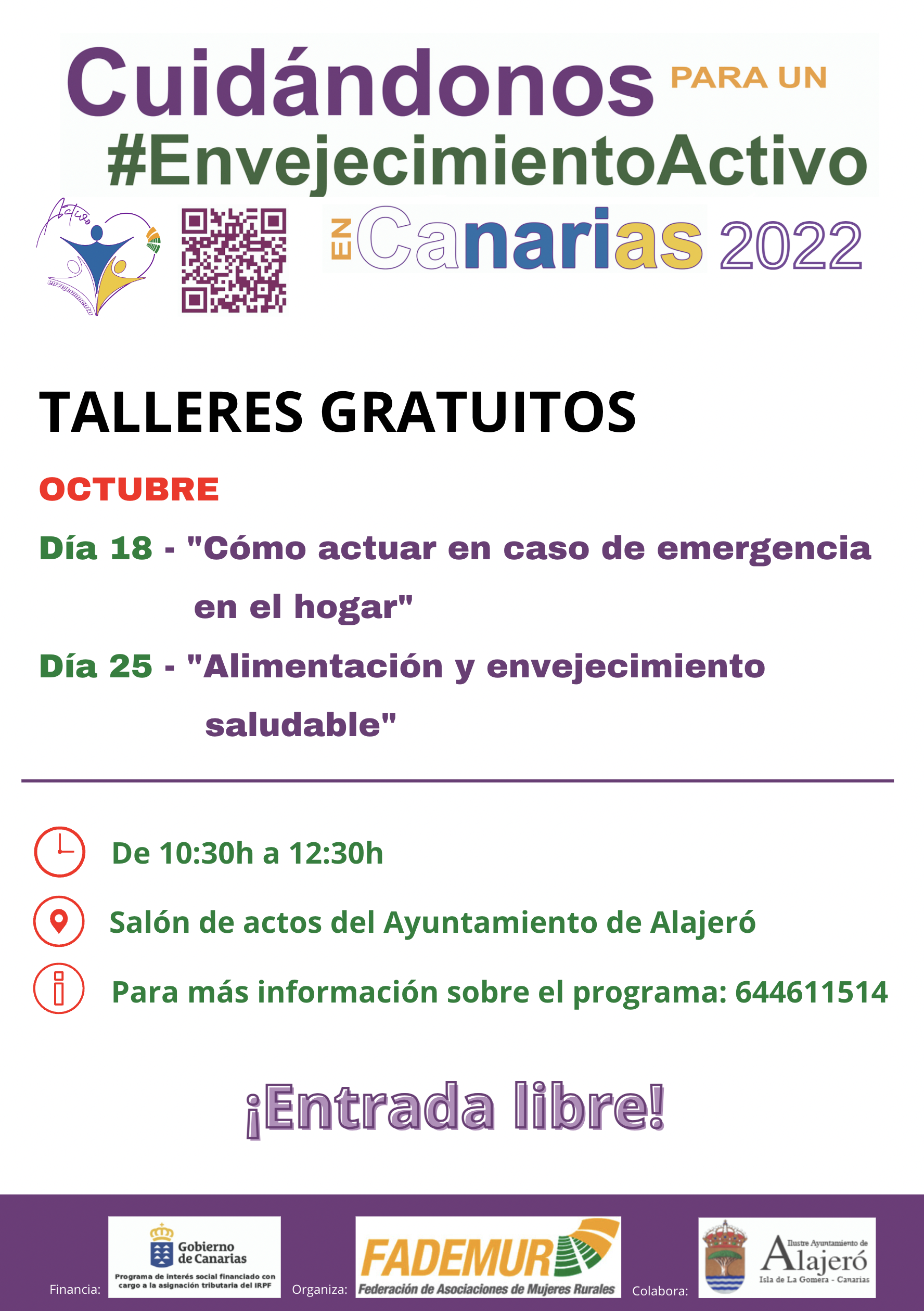 En este sentido el día 18 y el 25 de octubre entre las 10:30 horas y las 12:30 horas en el salón de actos del Ayuntamiento de Alajeró se llevará a cabo el taller ‘Cómo actuar en caso de emergencia en el hogar’ y ‘Alimentación y envejecimiento saludable’ respectivamente.