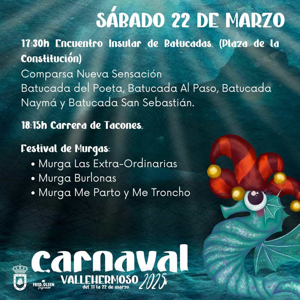 Mañana sábado, 22 de marzo, desde las 17:30 horas, la Plaza de la Constitución será escenario del Encuentro Insular de Batucadas, que contará con la participación de la Comparsa Nueva Sensación, la Batucada del Poeta, Batucada Al Paso, Batucada Naymá y Batucada San Sebastián. A las 18:15 horas será el turno de la divertida Carrera de Tacones, una de las actividades más esperadas del carnaval.