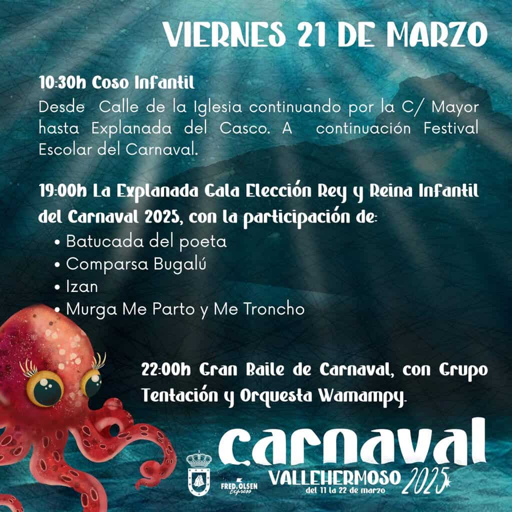 Por la tarde, a las 19:00 horas, tendrá lugar la Elección del Rey y la Reina Infantil del Carnaval, con las actuaciones de la Batucada del Poeta, la Comparsa Bugalú, el cantante Izan y la Murga Me Parto y Me Troncho. La jornada culminará con el Gran Baile de Carnaval, a partir de las 22:00 horas, amenizado por el Grupo Tentación y la Orquesta Wamampy.
