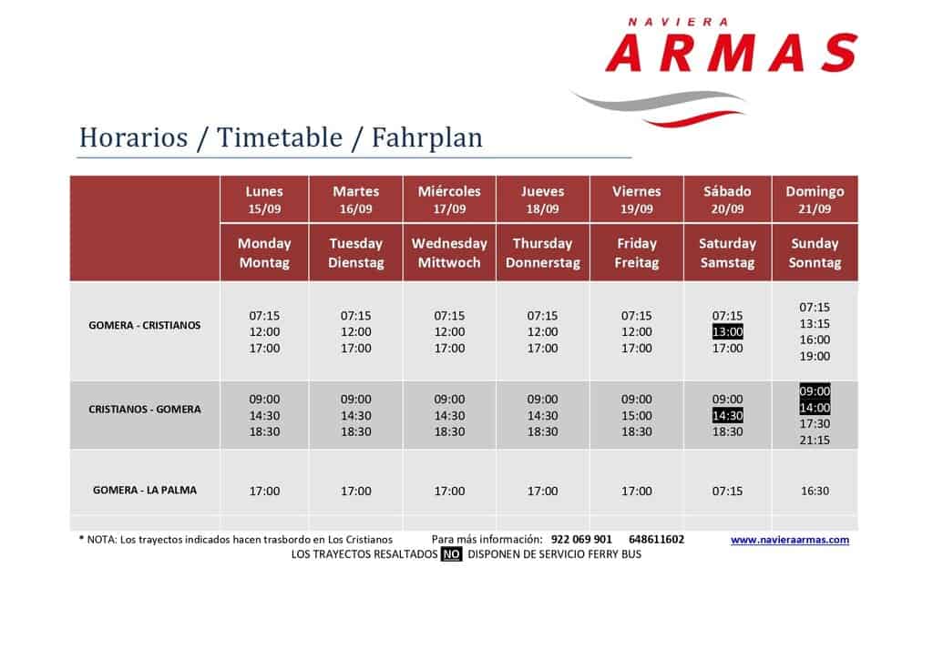 Naviera Armas informa de los horarios de sus trayectos entre los puertos de San Sebastián de La Gomera, Los Cristianos en el sur de Tenerife y Santa Cruz de La Palma entre los días 15 de septiembre a 21 de septiembre de 2025, de acuerdo a lo señalado en la siguiente imagen: