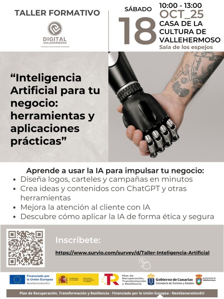 El Ayuntamiento de Vallehermoso ha abierto la inscripción para el taller práctico gratuito “Inteligencia Artificial para tu negocio: herramientas y aplicaciones prácticas”, que se celebrará el sábado 18 de octubre, de 10:00 a 13:00 horas, en la Casa de la Cultura de Vallehermoso (Sala de los Espejos).