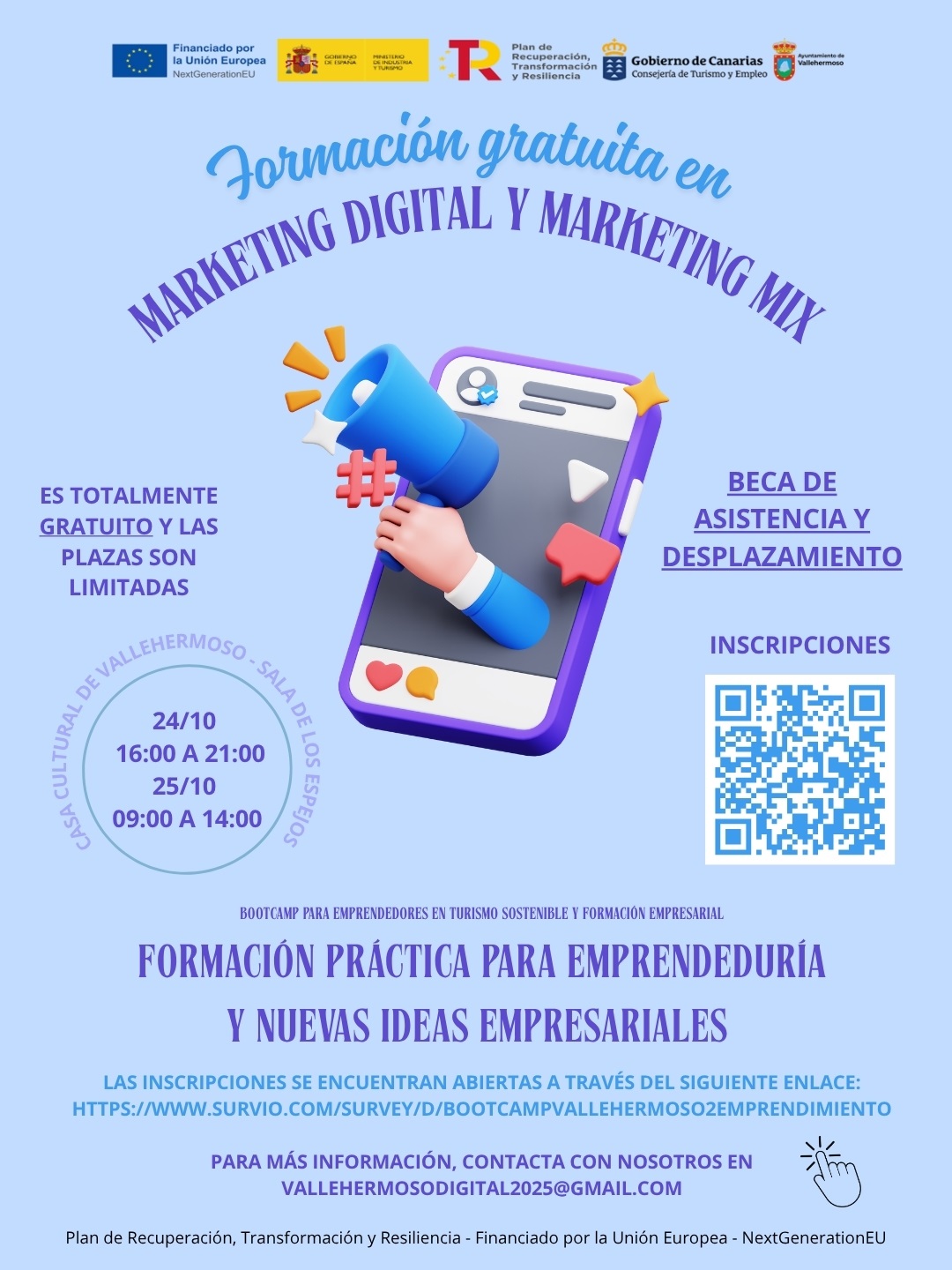 El Ayuntamiento de Vallehermoso organiza una nueva edición del Bootcamp para personas emprendedoras en turismo sostenible y formación empresarial, centrado en marketing digital y marketing mix, con el objetivo de seguir impulsando la innovación, la digitalización y la competitividad del tejido empresarial local.