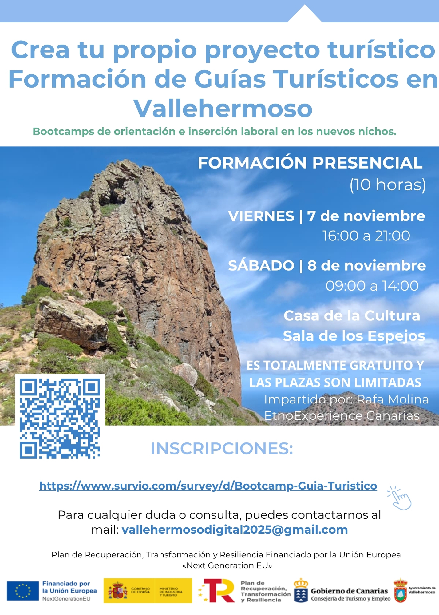 El Ayuntamiento de Vallehermoso anuncia la puesta en marcha de la formación “Crea tu propio proyecto turístico – Formación de Guías Turísticos en Vallehermoso”, una iniciativa gratuita dirigida a personas del municipio y su entorno interesadas en desarrollar nuevas oportunidades profesionales vinculadas al turismo local y de naturaleza.