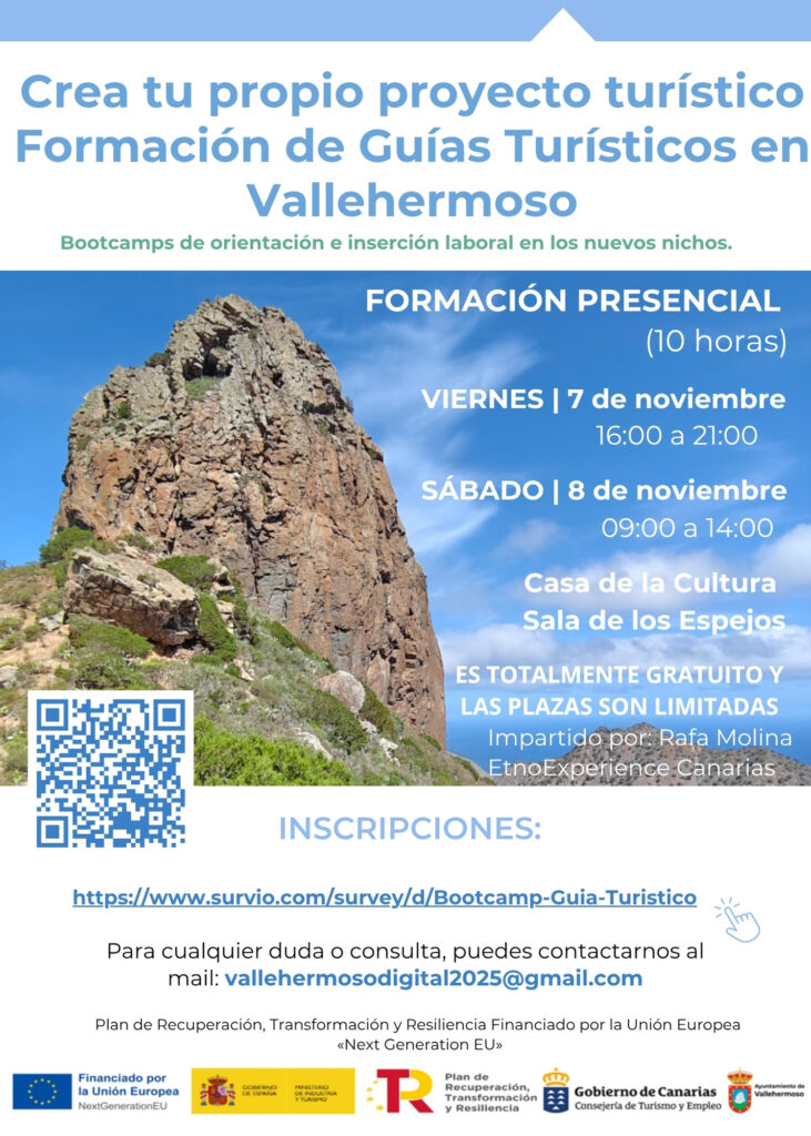El Ayuntamiento de Vallehermoso anuncia la puesta en marcha de la formación “Crea tu propio proyecto turístico – Formación de Guías Turísticos en Vallehermoso”, una iniciativa gratuita dirigida a personas del municipio y su entorno interesadas en desarrollar nuevas oportunidades profesionales vinculadas al turismo local y de naturaleza.