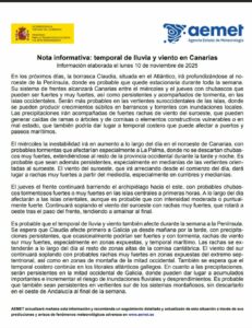 La Agencia Estatal de Meteorología (Aemet) ha elevado los avisos amarillos por lluvia a avisos naranjas (riesgo importante) en La Palma y Tenerife, y ha añadido a Gran Canaria, por lluvias acumuladas de más de 30 litros por metro cuadrado en una hora y de 100 litros/m2 en doce horas. Además, ha extendido los avisos amarillos por tormentas y lluvia a Lanzarote.