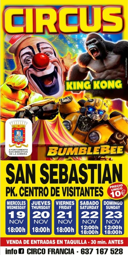 Este circo sin animales ofrecerá una función a las 18:00 horas los días 19 y 20 (miércoles y jueves) y dos funciones (12:00 horas y 18:00 horas) durante el viernes, sábado y domingo, 21, 22 y 23 de este mismo mes, respectivamente en su carpa, que será instalada en el centro de Visitantes de la capital insular de La Gomera con unas entradas que tienen un precio de 10 euros tanto para niños como para adultos y que estará solamente disponibles en taquilla cada 30 minutos antes de cada función.