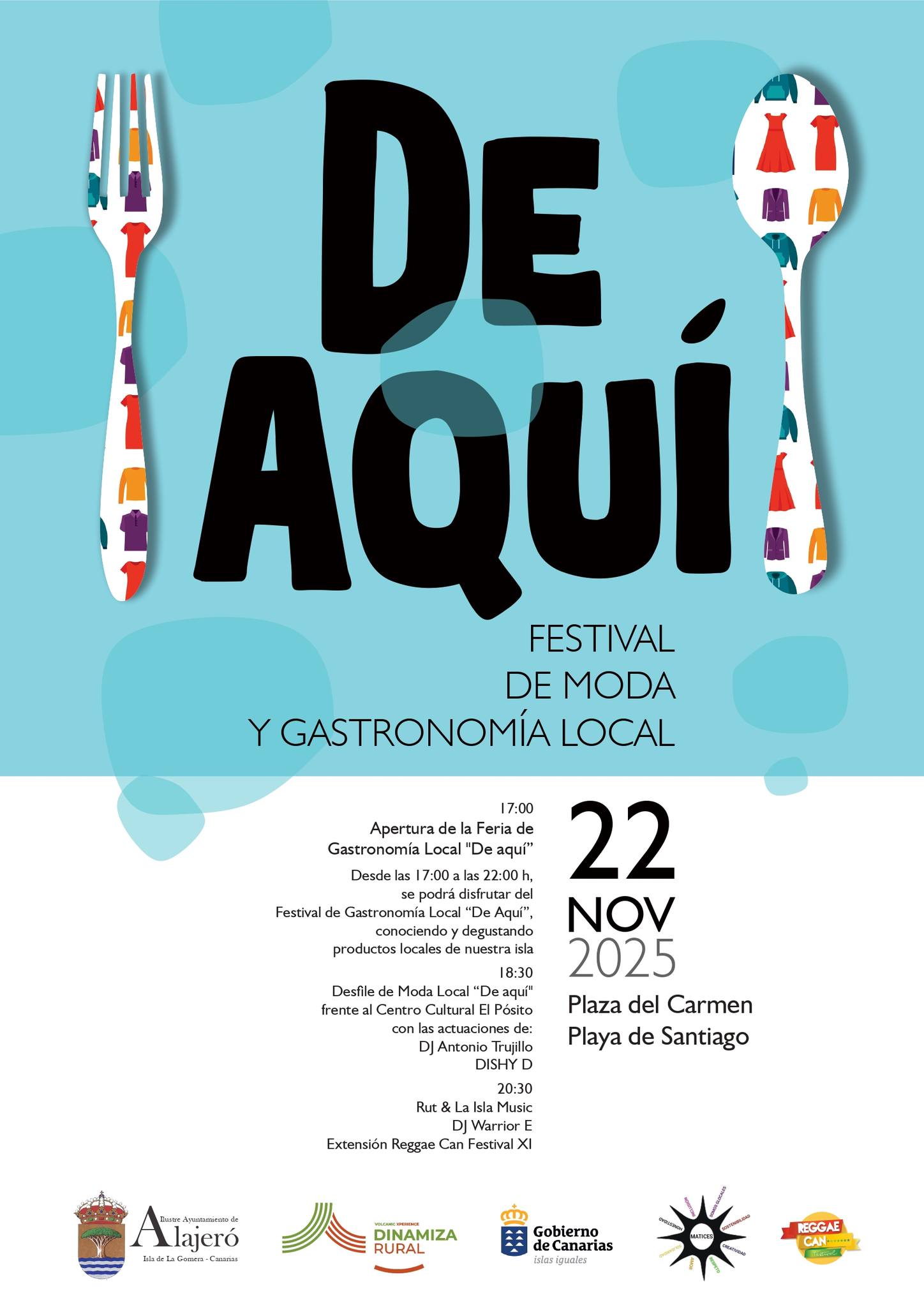 El Ayuntamiento de Alajeró presenta «DE AQUÍ», un festival que conecta moda, gastronomía y territorio en un evento diseñado para poner en valor el comercio local y los productores de La Gomera. La cita, que se desarrollará frente al Centro Cultural El Pósito y en la plaza del Carmen, propone una experiencia completa a orillas del mar: desfiles, degustaciones y música en directo.