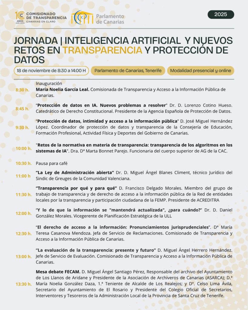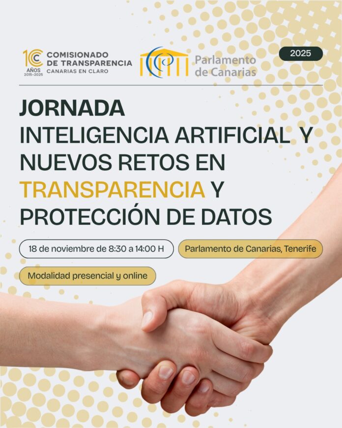 El Parlamento de Canarias acogerá el próximo 18 de noviembre, de 8:30 a 14:00 horas, la jornada “Inteligencia Artificial y nuevos retos en transparencia y protección de datos”, organizada por el Comisionado de Transparencia y Acceso a la Información Pública de Canarias con motivo de su 10º aniversario (2015–2025).