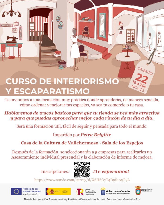 El Ayuntamiento de Vallehermoso continúa reforzando su apuesta por el fortalecimiento del tejido comercial y la mejora de las competencias empresariales con la puesta en marcha de un curso especializado en Interiorismo y Escaparatismo, una formación gratuita que tendrá lugar el sábado 22 de noviembre, de 16:00 a 20:00 horas, en la Sala de los Espejos de la Casa de la Cultura.