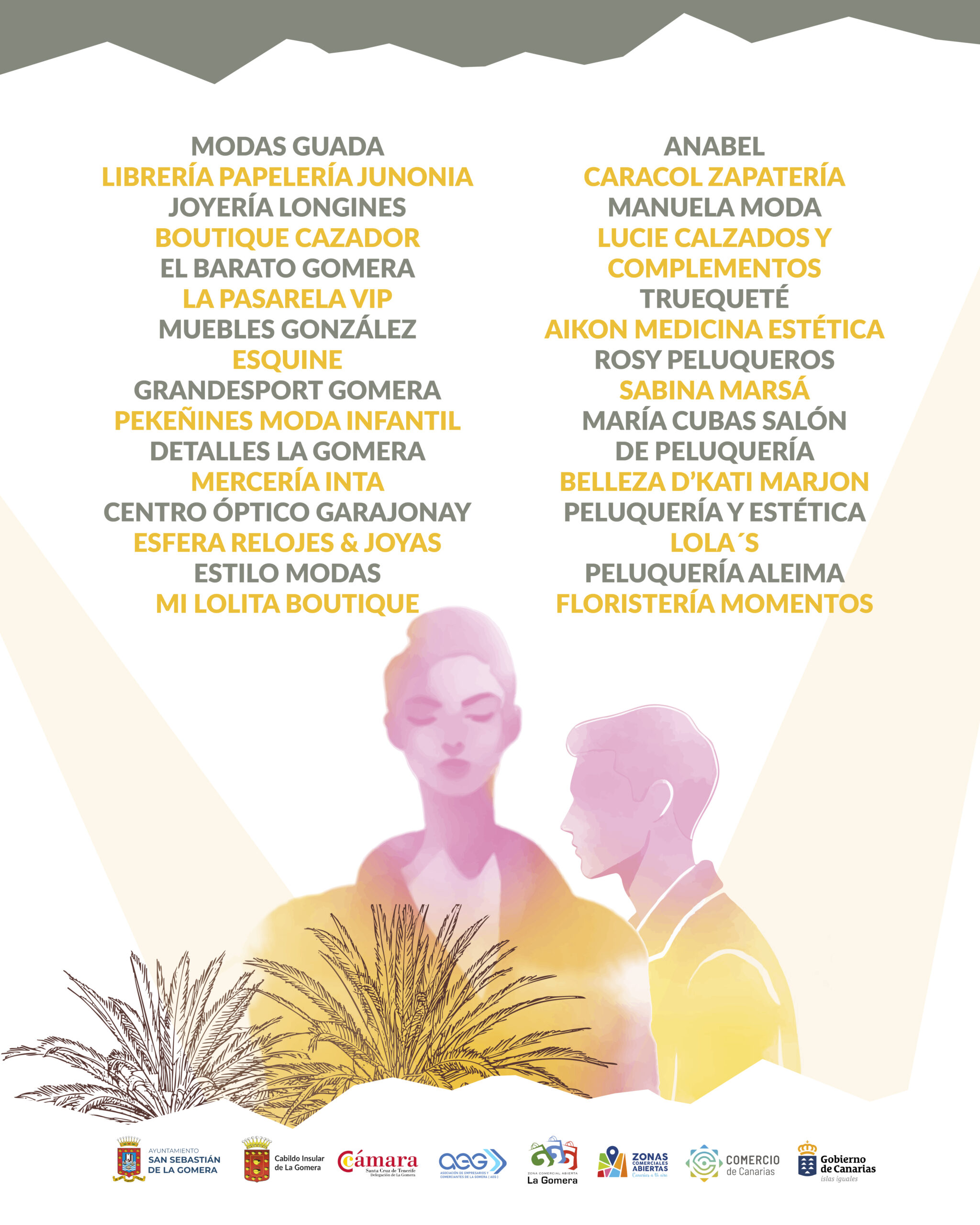 Más de 50 modelos desfilarán para Modas Guada; Librería Papelería Junonia; Joyería Longines; Boutique El Cazador; El Barato Gomera; La Pasarela VIP; Muebles González; Esquine; Grandesport Gomera; Pekeñines Moda Infantil; Detalles La Gomera; Mercería Inta; Centro Óptico Garajonay; Esfera Relojes & Joyas; Estilo Modas; Mi Lolita Boutique; Anabel; Caracol Zapatería; Manuela Moda; Lucie Calzados y Complementos; Truequeté; Aikon Medicina Estética; Rosy Peluqueros; Sabina Marsá; María Cubas Salón de Peluquería; Belleza D’Kati Marjon; Peluquería y Estética Lola’s; Peluquería Aleima; Floristería Momentos.