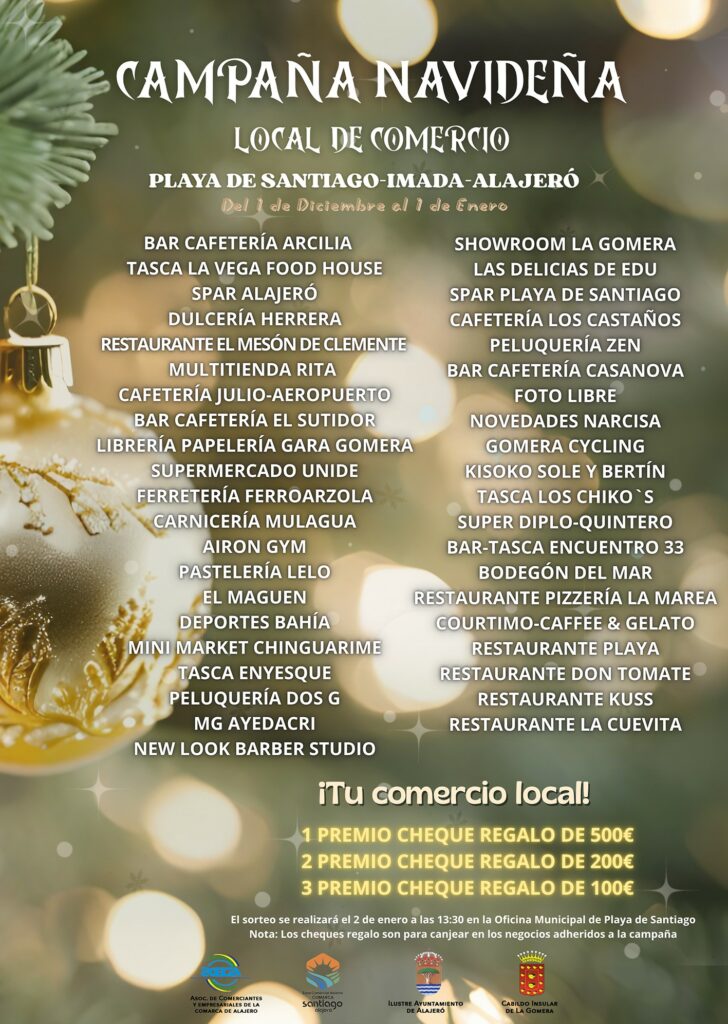 La ‘Campaña Navideña Local de Comercio’ da comienzo el próximo 1 de diciembre y se prolongará hasta el 1 de enero de 2026 en el municipio sureño gomero de Alajeró contando con la colaboración de más de 40 establecimientos de su casco municipal, Playa de Santiago e Imada participantes en una iniciativa que tiene como fin principal incentivar la vida comercial de esta localidad sureña y que lleva celebrándose desde hace varios años con un gran éxito de participación.