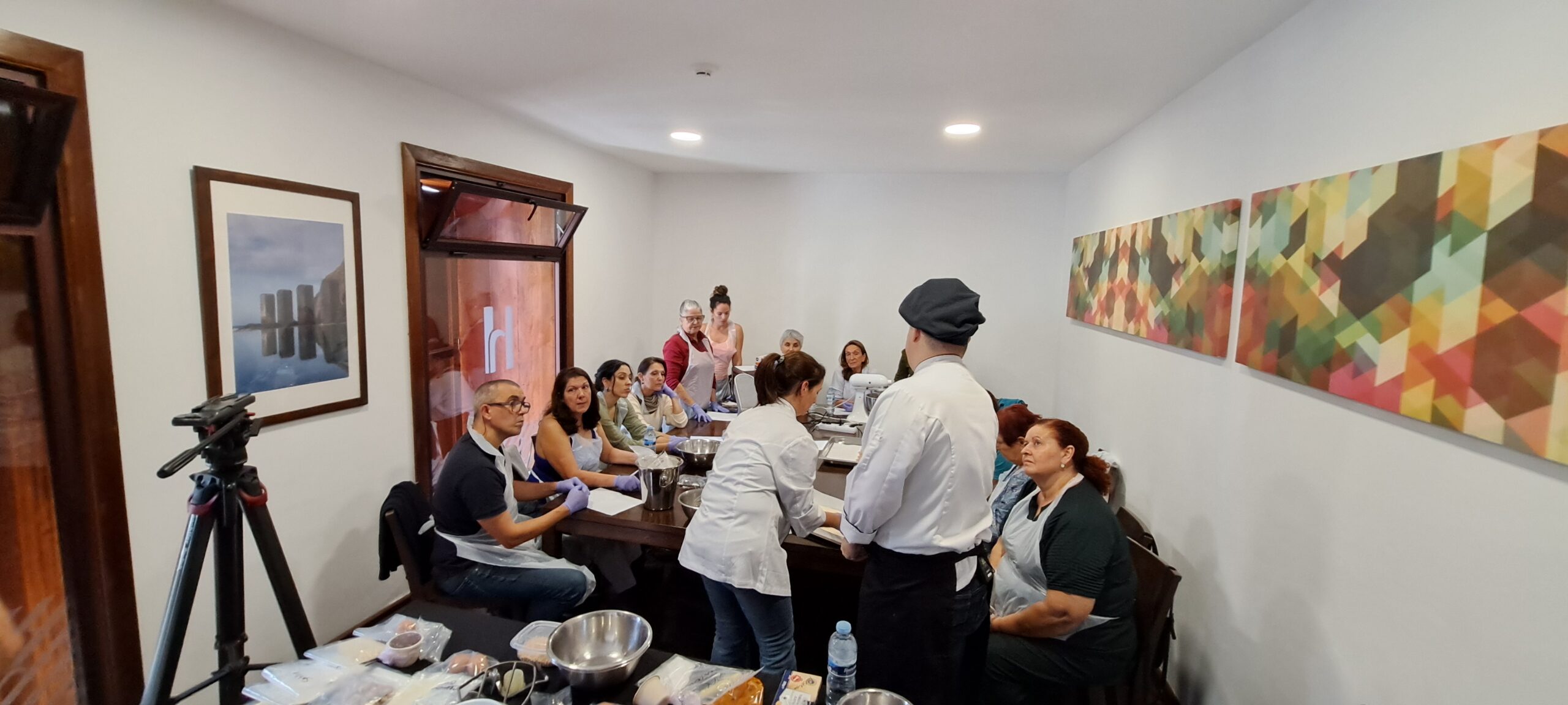 El jefe de Cocina del Hotel Escuela Santa Cruz, Carlos Bruno, dedicó las casi seis horas del curso a detallar los ingredientes de cada una de estas recetas de la repostería canaria a más de diez personas que participaron en este taller formativo organizado por Hecansa. A su lado, Betsy Alfonso del Pino, pastelera del Hotel Escuela Santa Cruz, desveló a los participantes trucos y métodos de elaboración de estos productos típicos de estas fechas en las islas.