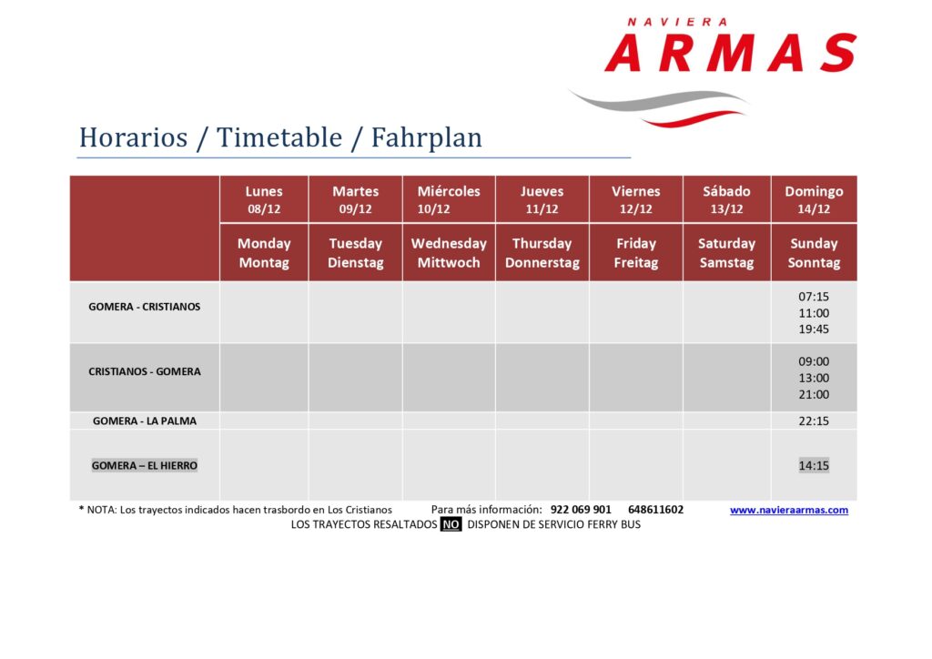Naviera Armas informa de la modificación de los horarios de sus trayectos entre los puertos de San Sebastián de La Gomera, Los Cristianos en el sur de Tenerife y la isla de El Hierro para este domingo, 14 de diciembre, según se establece en la siguiente imagen: