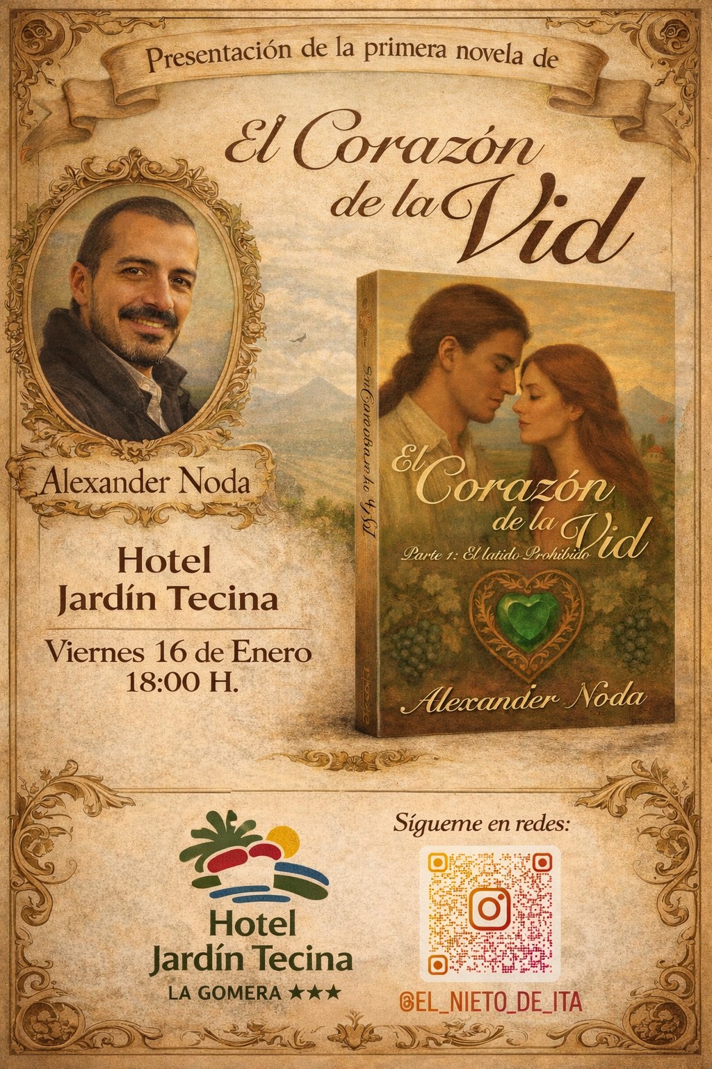 Alexander Noda, escritor gomero, nacido en Playa de Santiago (Alajeró, 1985), debuta en el panorama literario con la publicación de su primera novela, El Corazón de la Vid. Parte I: El latido Prohibido, una obra de corte romántico e histórico que invita al lector a sumergirse en una historia de amor marcada por el destino, la tradición y los sentimientos más profundos y lo hace en una presentación pública en el Hotel Jardín Tecina este viernes 16 de enero a las 18:00 horas.