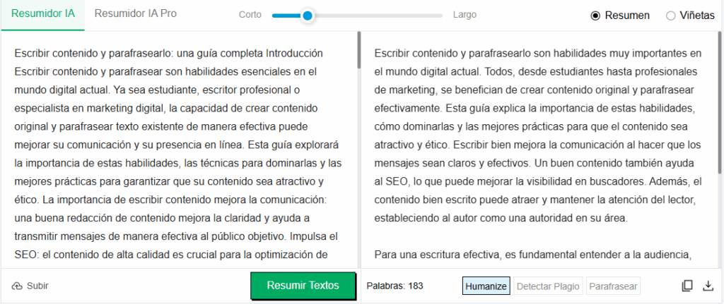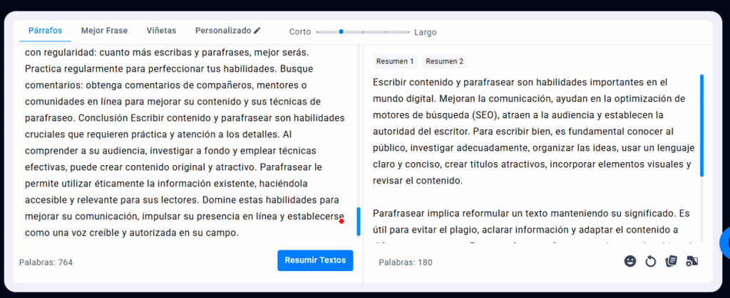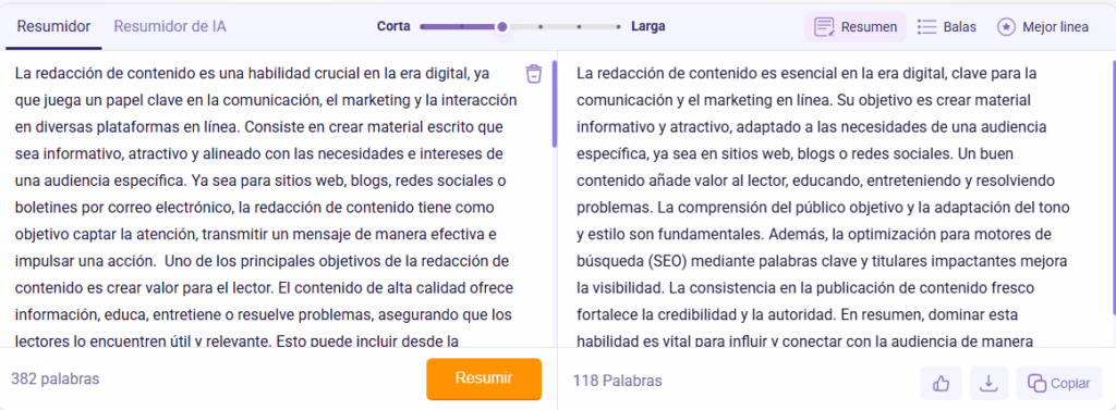 La herramienta realiza resúmenes extractivos y abstractivos. Esto significa que no solo condensa el texto extenso, sino que también mejora la selección de palabras y la estructura de las oraciones para un resumen de mayor calidad.
