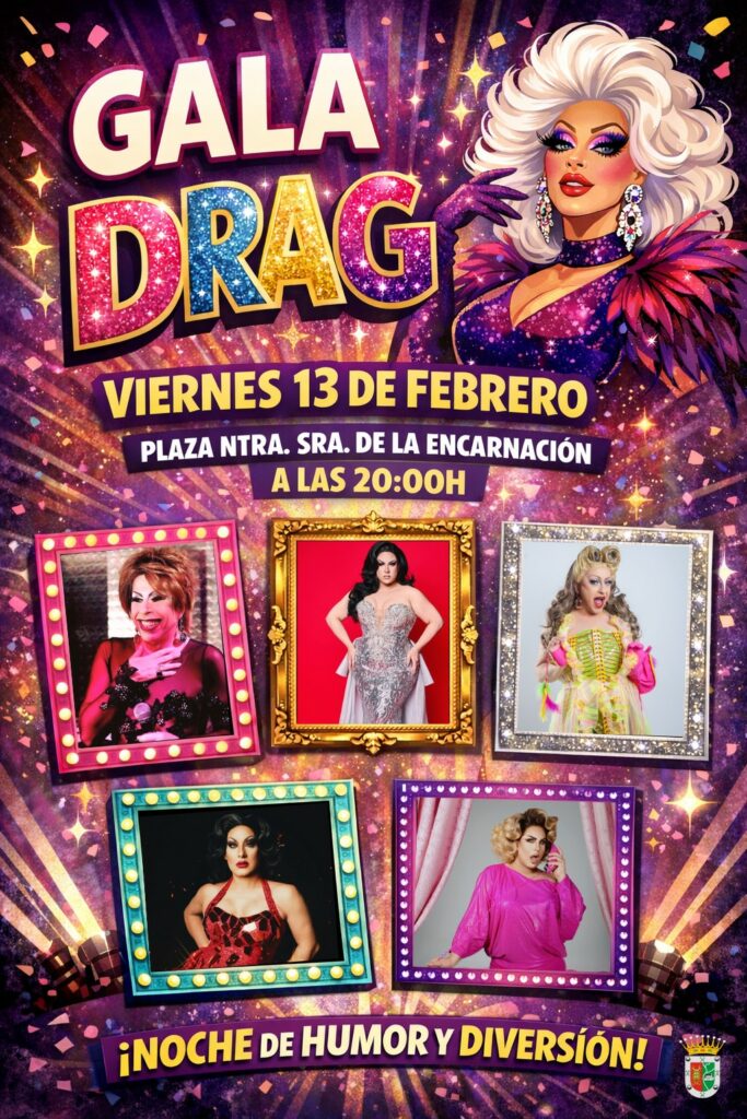Las actividades darán comienzo este viernes 13 de febrero con la Gala Drag adulta, que se celebrará a las 20:00 horas en la Plaza de Ntra. Sra. de la Encarnación. La velada contará con las actuaciones de Exhuberancia Carey, Soberbia Drag, Puppi Poisson, Eva Harrington y Lolo Marrero, en una noche marcada por el humor, el talento y la diversión.