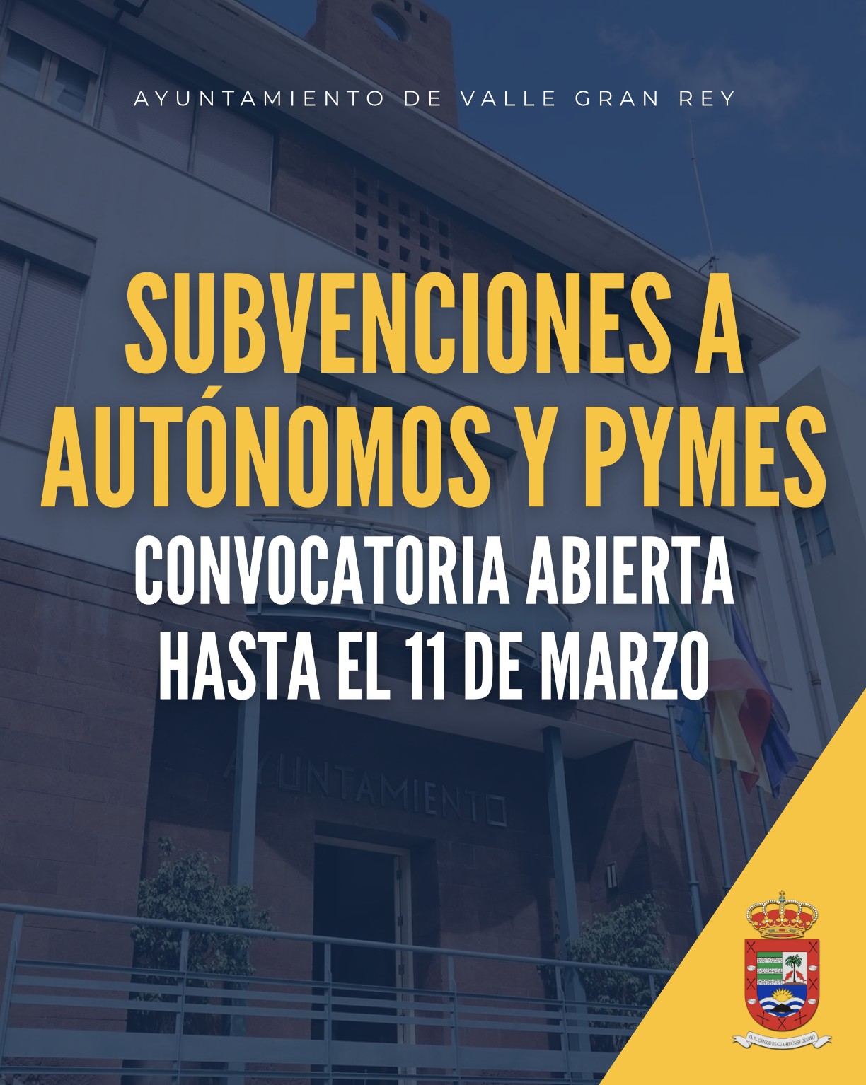 El Ayuntamiento de Valle Gran Rey, a través del Área de Comercio, ha abierto el plazo para solicitar las subvenciones destinadas a trabajadores autónomos y pequeñas y medianas empresas (PYMES) del municipio, con el objetivo de favorecer el mantenimiento, fomento y consolidación del tejido empresarial y comercial local durante el ejercicio 2026.