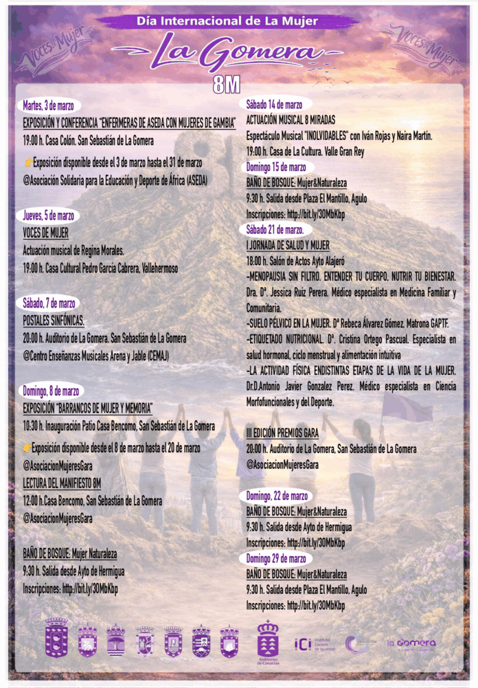 La Gomera presenta el programa ‘Voces de Mujer’ para conmemorar el 8 de marzo con una agenda que recorre los seis municipios de la isla. Bajo este lema, el Cabildo ha diseñado un calendario de actividades que se extiende durante todo el mes de marzo para visibilizar el papel femenino en la sociedad, la salud y la cultura, en colaboración con los Ayuntamientos y la Asociación de Mujeres Gara.