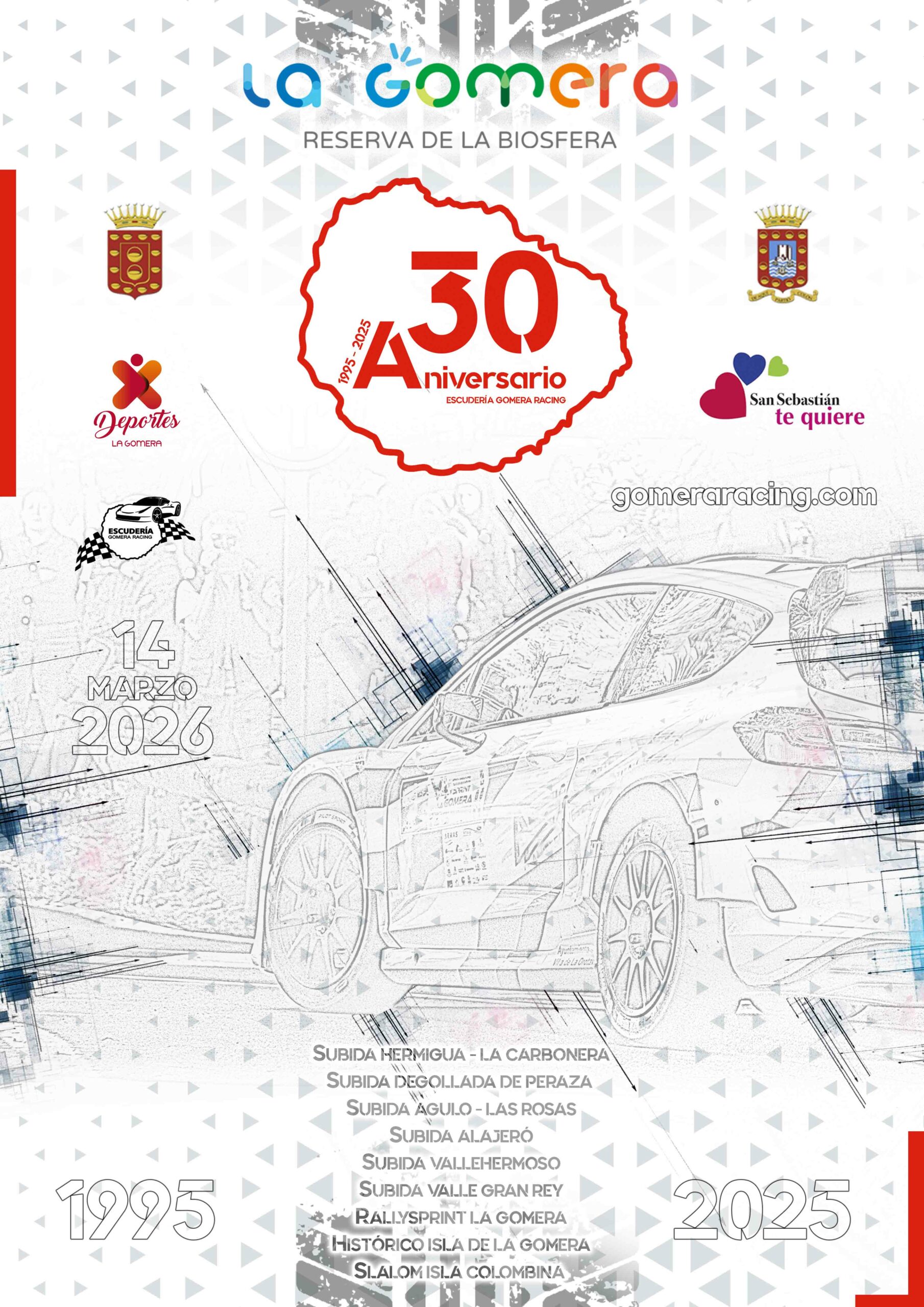Todos los días no se cumplen 30 años organizando carreras. Contra viento y marea, nunca mejor dicho, la Escudería Gomera Racing sacará adelante los actos para conmemorar sus tres décadas organizando competiciones en la isla colombina. Será el sábado 14 de marzo, a partir de las 10:00 h, en el Centro de Visitantes ubicado en la capital, San Sebastián de La Gomera.