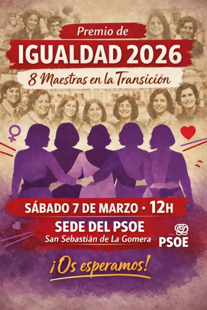 Carmen, Cecilia, Mary Carmen, Luisa, Olimpia, María Esther, María Victoria y Oilda son las mujeres que este próximo sábado el PSOE de San Sebastián de La Gomera distinguirá con el premio de igualdad 2026 por haber sido figuras destacadas en la isla durante la Transición en la construcción de una sociedad más igualitaria.