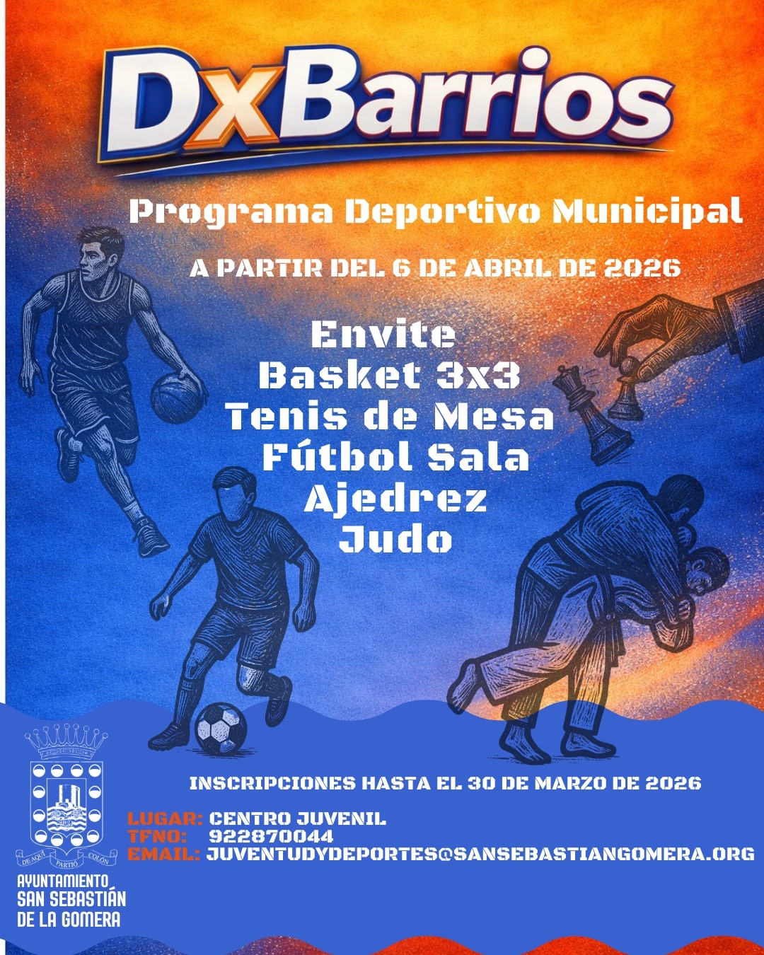 El Ayuntamiento de San Sebastián de La Gomera, a través de la Concejalía de Deportes, pone en marcha DxBarrios, un programa de actividades deportivas y de ocio que se celebrará durante los meses de abril, mayo y junio, con diferentes disciplinas deportivas y de ocio como ajedrez, baloncesto 3×3, envite, fútbol sala, tenis de mesa y judo.