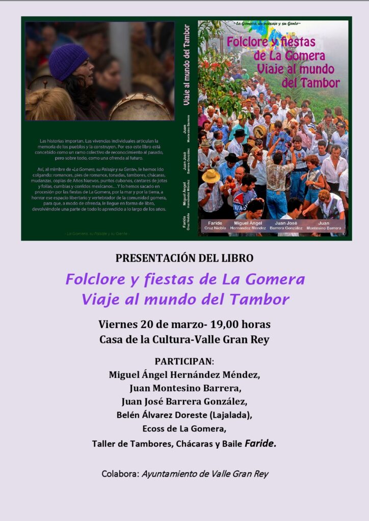 El próximo viernes, 20 de marzo será presentado el libro ‘Folclore y fiestas de La Gomera. Viaje al mundo del Tambor’ en la Casa de la Cultura de Valle Gran Rey a las 19:00 horas.