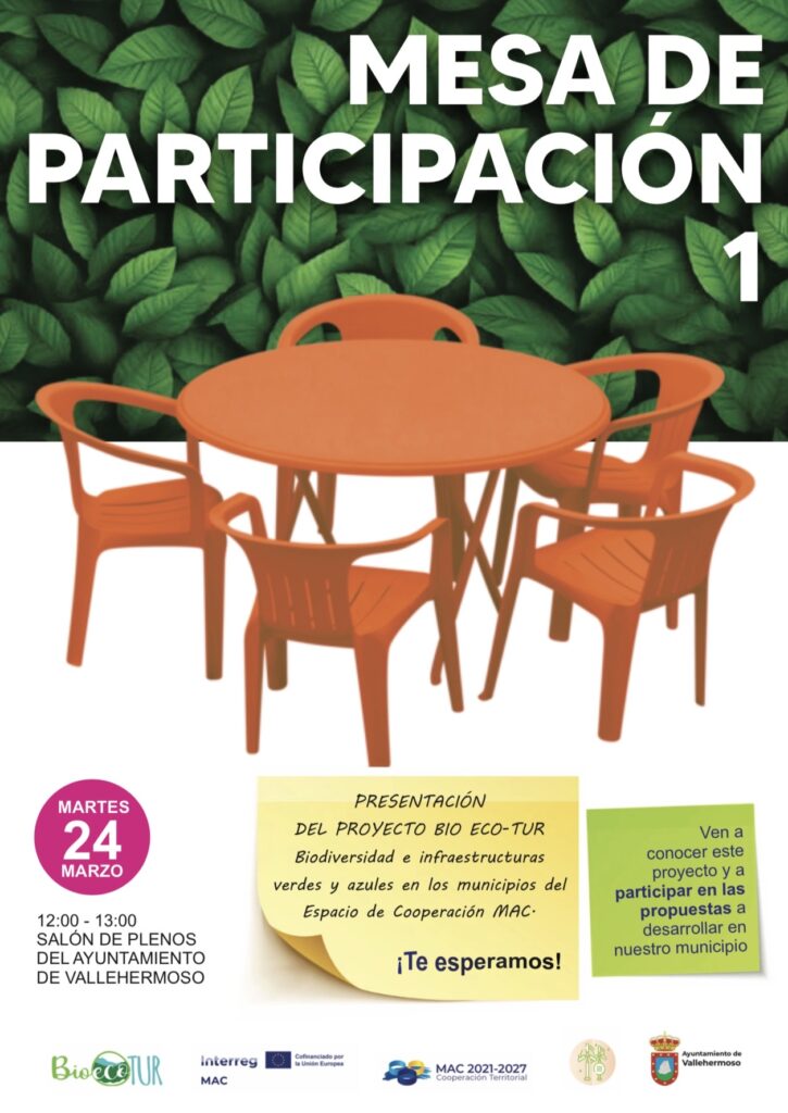 El Ayuntamiento de Vallehermoso presentará la próxima semana el proyecto Bio Eco Tur, una iniciativa centrada en la biodiversidad y el desarrollo de infraestructuras verdes y azules en los municipios del Espacio de Cooperación MAC, a través de tres mesas de participación que permitirán recoger propuestas y aportaciones de distintos sectores del municipio.