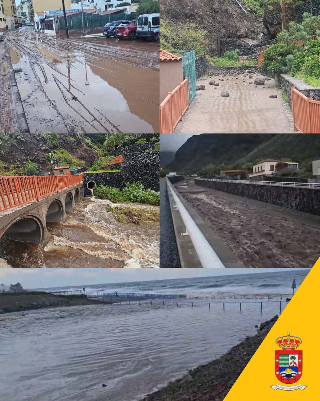 El Ayuntamiento de Valle Gran Rey informa de las distintas incidencias registradas en el municipio durante el paso de la borrasca Therese, que ha provocado importantes afecciones derivadas de las lluvias, el viento, el oleaje y las escorrentías en diferentes zonas del término municipal.