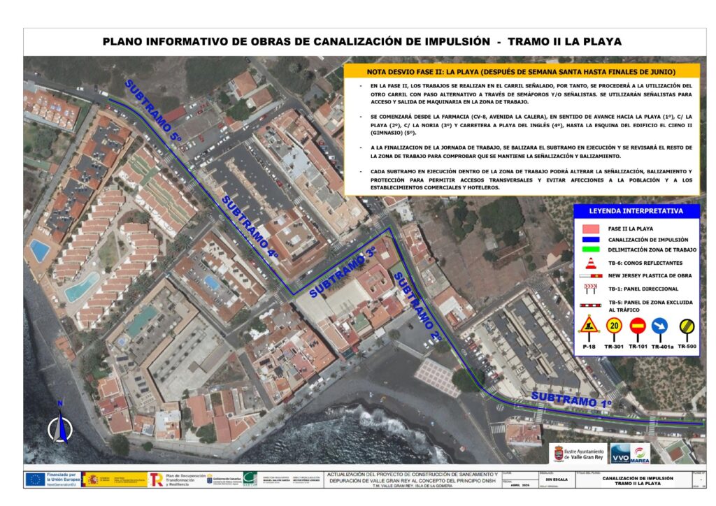 El Ayuntamiento de Valle Gran Rey continúa avanzando en la ejecución de la obra de remodelación de la Estación Depuradora de Aguas Residuales (EDAR) con el inicio de la fase II de los trabajos de canalización de la impulsión de agua regenerada, una actuación clave para mejorar el sistema de saneamiento del municipio. Esta intervención, que se desarrolla en colaboración con la Consejería de Política Territorial, Cohesión Territorial y Aguas del Gobierno de Canarias, entra ahora en una fase que implicará afecciones directas al tráfico y a la movilidad en el barrio de La Playa.