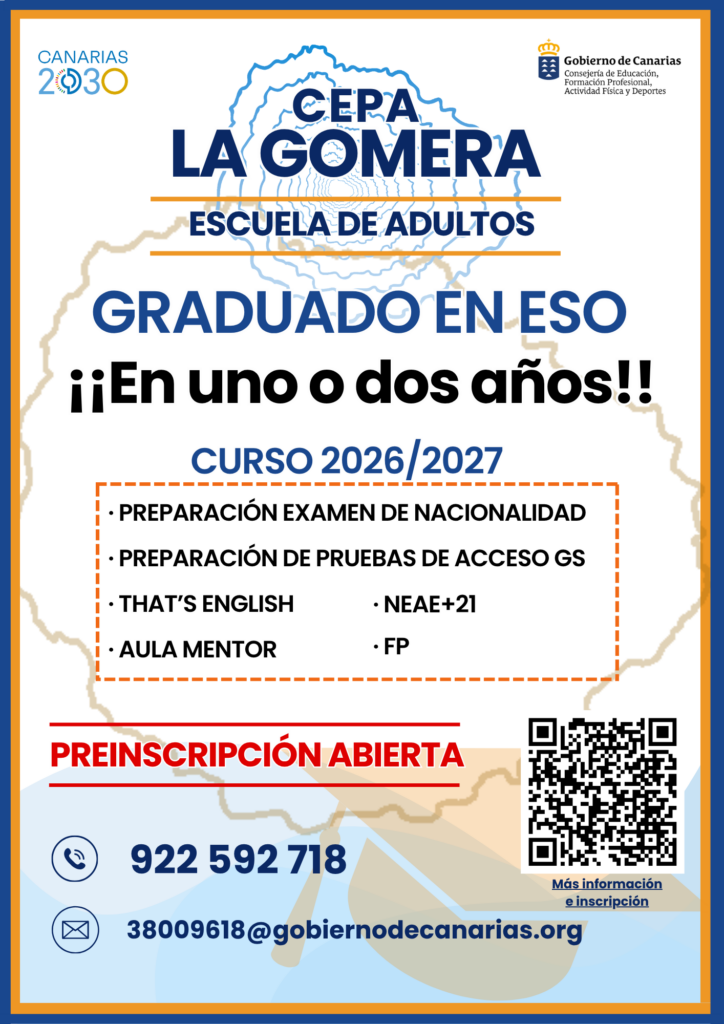 El CEPA La Gomera (Centro de Educación de Personas Adultas) tiene el plazo de preinscripción abierto desde el 9 al 24 de abril para el próximo curso escolar 2026/2027 en las enseñanzas de Graduado en ESO y FP.