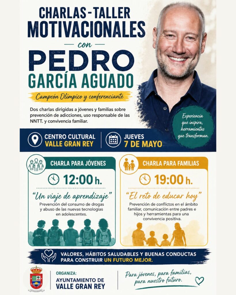 El Ayuntamiento de Valle Gran Rey organiza el próximo jueves 7 de mayo dos charlas-taller motivacionales a cargo del reconocido conferenciante y campeón olímpico Pedro García Aguado, dirigidas tanto a jóvenes como a familias del municipio.